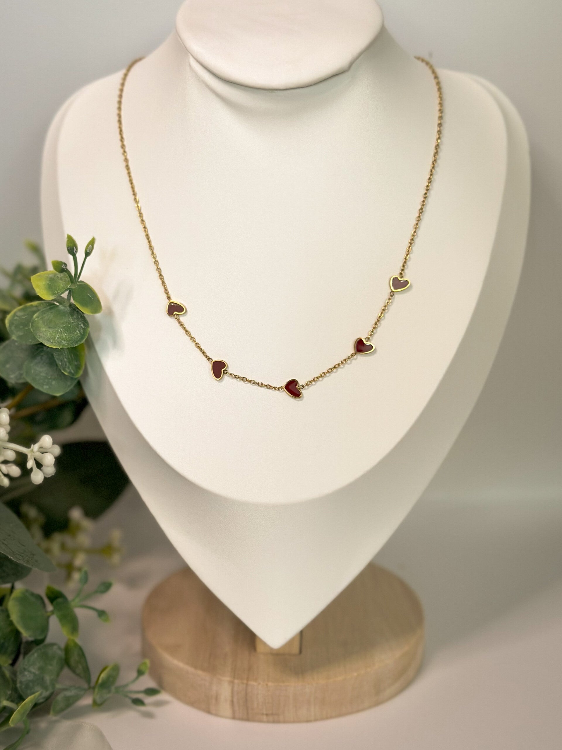 Un délicat collier doré orné de petits cœurs rouges qui s’enchaînent tout en légèreté. Une pièce tendre et féminine, parfaite pour offrir (ou s’offrir) un peu d’amour au quotidien.